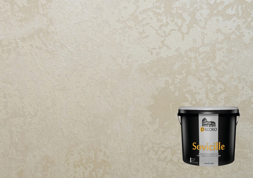 Sovicille – матовое декоративное покрытие, имитирующее эффект велюра с нежными переливами, которое, благодаря тонким цветовым и тональным переходам придаст интерьеру особый шарм и аристократичность. Высокая плотность материала позволяет легко формировать разнообразные рельефные узоры и воплощать в реальность самые изысканные задумки дизайнеров.